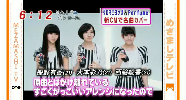 Assim como a Koda Kumi, o grupo Perfume também estrelará o comercial do PEPSI NEX. Cantando Lovefool, cover da banda The Cardigan's; o comercial estreiará na TV no dia 12 de junho. Confira a prévia do comercial exibido hoje no programa Mezamashi TV.